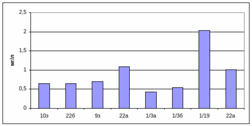 Содержание нефтепродуктов в питьевых подземных водах не превышает установленных норм, за исключением участка, расположенного к северо-востоку от городского водозабора (скважина 153в), превышение допустимых концентраций в 1,55 раза ( в 2004г. превышение было в 1,4 раза).