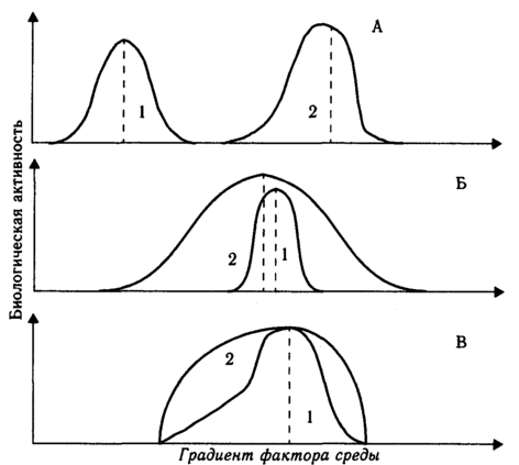В третьем случае (рис. 4.2, В) следует обратить внимание уже не на ширину биоинтервала, а на форму диаграмм выживания - характер изменений функций отклика при отклонениях от оптимума. Они требуют более детального анализа.