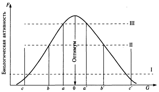 Зависимость биологической активности (функции отклика) от градиента фактора среды. Уровни жизнедеятельности, необходимые для сохранения жизни в экстремальных условиях (I), для нормального существования особи (II) и существования популяции (III), определяют соответственно экстремальные значения фактора (от с до с' - биоинтервал фактора), пределы выносливости особи (b и b') и популяции (а и а’)