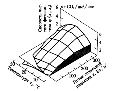 Рис. 4.3. Экологическая ниша для скорости фотосинтеза у вереска, определяемая биоинтервалами температуры и интенсивности солнечной радиации