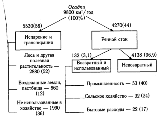Рис. 5.4. Распределение водных ресурсов России. Слагаемые и использование годового стока рек