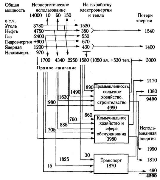 Рис. 5.6. Стриктура энергетического баланса техносферы в 1995 г. (ГВт)