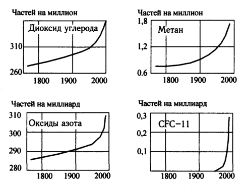 Рис. 6.7. Изменения концентрации парниковых газов с начала промышленной революции по настоящее время