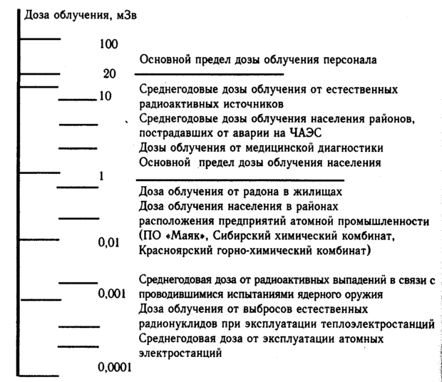 Рис. 6.8. Сравнительная шкала доз облучения населения стран СНГ и рекомендуемых дозовых пределов