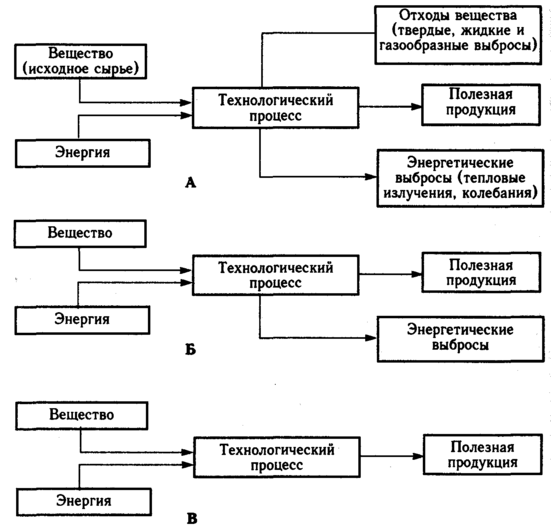 Модели производственных процессов с точки зрения экологии. Любой производственный процесс представляет собой некоторую систему, органически связанную с внешней средой. Такая производственная система получает из окружающей среды исходное сырье, материалы, энергию, а отдает в нее готовую продукцию и всевозможные отходы. Функционирование системы осуществляется благодаря потоку энергии, подводимой извне (электрической, солнечной и т.п.) либо генерируемой внутри системы за счет физико-химических процессов. К отходам относятся все вещества и материалы, тепловые выбросы, физические и биологические агенты, которые попадают во внешнюю среду и в дальнейшем уже не участвуют в получении продукции или энергии.