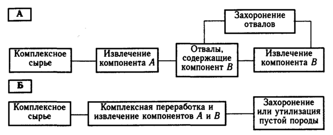 Комплексная переработка сырья направлена не только на бережное расходование природных ресурсов, но и на уменьшение поступления отходов в окружающую среду и тем самым на предохранение ее от техногенных загрязнений. Предположим, что в добываемой руде содержатся полезные компоненты двух видов: Л и В. Если добывающее и перерабатывающее предприятия нацелены на извлечение только компонента Л, то компонент В попадает в отвалы и станет загрязнителем окружающей среды. В соответствии с традиционной технологией «конца трубы» (Голуб, Струкова, 1995) мы имеем две возможности (рис. 10.3, А): захоронить отвалы либо их переработать. По этой схеме компонент В не используется совсем либо процесс его извлечения выпадает из основного производства. Альтернативой служит комплексная переработка сырья, требующая кардинального изменения технологии (рис. 10.3, Б). После извлечения всех полезных компонентов пустая порода также может быть использована, например, в строительстве.