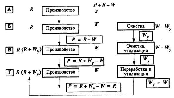В замкнутом производственном цикле (рис. 10.2, Г) происходит полная переработка и утилизация потока отходов Wy, который вновь возвращается в сферу производства. Здесь потоки W и Wy количественно равны, а поток готовой продукции Р соответствует потоку R.
