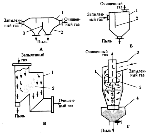 А - пылеосадительная камера: 1 - корпус, 2 - бункер, 3 - перегородка; Б - инерционный пылеуловитель: 1 - корпус, 2 - перегородка; В - жалюзийный пылеуловитель: 1 - корпус, 2 - решетки; Г - циклон: 1 - корпус, 2 - входной патрубок, 3 - выходная труба, 4- бункер