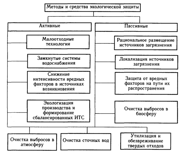 Классификация средств экологической защиты. Под средозащитной техникой понимается совокупность технических средств и технологических методов, предназначенных для защиты окружающей природной среды от промышленных загрязнений. Все методы и средства защиты среды можно разделить на две большие группы: активные и пассивные (рис. 10.4).