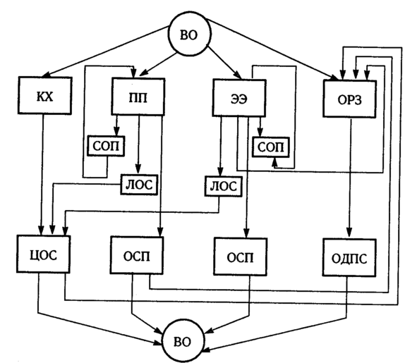 ВО - водный объект; КХ - коммунальное хозяйство; ПП - промышленное производство; ЭЭ - электроэнергетика; ОРЗ - орошаемое земледелие; СОП - система оборотного и повторного использования вод; ЛОС - локальные очистные сооружения; ЦОС - централизованные очистные сооружения; ОСП - очистные сооружения предприятий; ОДПС - система обработки дренажного и поверхностного стока