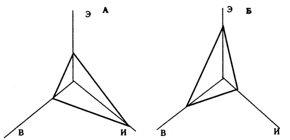 Возрастание информационного потенциала общества влияет на материалоемкость и энергоемкость всей экономики, так как во всех материальных системах, способных к эволюции, существуют замещающие взаимоотношения между веществом, энергией и информацией. Это можно проиллюстрировать простой схемой (рис. 10.11), где представлены два варианта конфигурации триады «вещество - энергия - информация» для национального хозяйства разных стран. Это могут быть, например, Япония (А) и Россия (Б). Хозяйственная структура «информационного общества» более экологична, потому что менее природоемка: В-Э («вещество-энергия») - сектор наибольшей природоемкости.