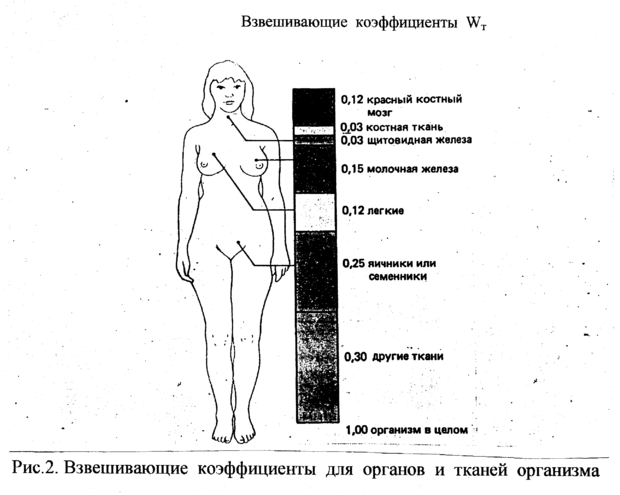 | Репродуктивные органы (гонады) Костный мозг, легкие, желудок Грудная железа, щитовидная железа, печень Клетки костных поверхностей, кожа | 0,20 0,12 0,05 0,01 |