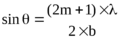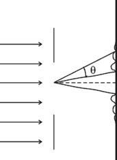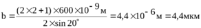 516. На непрозрачную пластину с узкой щелью падает нормально плоская монохроматическая световая волна (λ =600 нм). Угол отклонения лучей, соответствующих второму дифракционному максимуму, θ=20°. Определить ширину b щели.