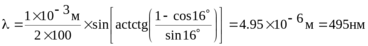 517. На дифракционную решетку, содержащую N = 100 штрихов на 1 мм, нормально падает монохроматический свет. Зрительная труба спектрометра наведена на максимум второго порядка. Чтобы навести трубу на другой максимум того же порядка, ее нужно повернуть на угол Δφ = 16°. Определить длину волны λ света, падающего на решетку.