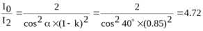 525. Пучок света последовательно проходит через два николя, плоскости пропускания которых образуют между собой угол α = 40°. Принимая, что коэффициент поглощения k каждого николя равен 0,15, найти, во сколько раз пучок света, выходящий из второго николя, ослаблен по сравнению с пучком, падающим на первый николь.