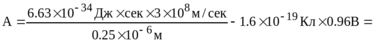 556. На металлическую пластину направлен пучок ультрафиолетового излучения (λ=0,25 мкм). Фототек прекращается при минимальной задерживающей разности потенциалов U = 0,96 В. Определить работу выхода А электронов из металла.