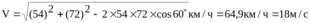 103. Две автомашины движутся по дорогам, угол между которыми α=60°. Скорость автомашин V1 = 54 км/ч и V2 = 72км/ч. С какой скоростью V удаляются машины одна от другой?