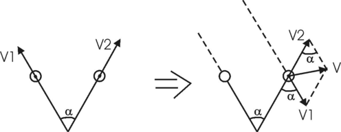 | V1 = 54 км/ч V2 = 72км/ч | Видно, что если поместить начало координат на первой машине, то скорость, с которой вторая машина удаляется от первой равна сумме векторов V1 и V2 (см. рис.). Причем ее модуль, как видно из рисунка, равен Подставляем числа. |