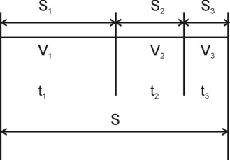 105. Велосипедист ехал из одного пункта в другой. Первую треть пути он проехал со скоростью V1=18 км/ч. Далее половину оставшегося времени он ехал со скоростью V2=22км/ч, после чего до конечного пункта он шел пешком со скоростью V3 = 5 км/ч. Определить среднюю скорость <V> велосипедиста.