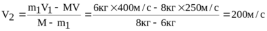 111. При горизонтальном полете со скоростью V = 250 м/с снаряд массой M =8кг разорвался на две части. Большая часть массой m1 = 6 кг получила скорость V1 = 400 м/с в направлении полета снаряда. Определить модуль и направление скорости V2 меньшей части снаряда.