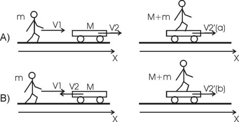 114. Человек массой m=70 кг, бегущий со скоростью V1=9 км/ч, догоняет тележку массой M=190кг, движущуюся со скоростью V2=3,6 км/ч, и вскакивает на нее. С какой скоростью станет двигаться тележка с человеком? С какой скоростью будет двигаться тележка с человеком, если человек до прыжка бежал навстречу тележке?