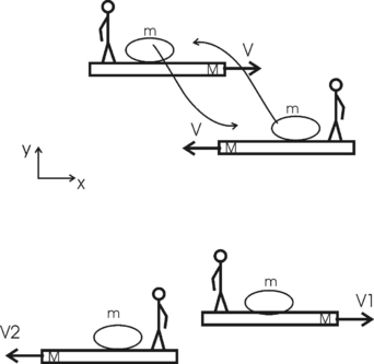 118. Две одинаковые лодки массами M = 200 кг каждая (вместе с человеком и грузами, находящимися в лодках) движутся параллельными курсами навстречу друг другу с одинаковыми скоростями V = 1 м/с. Когда лодки поравнялись, то с первой лодки на вторую и со второй на первую одновременно перебрасывают грузы массами m = 20 кг. Определить скорости V1 и V2 лодок после перебрасывания грузов.