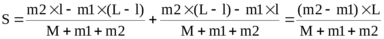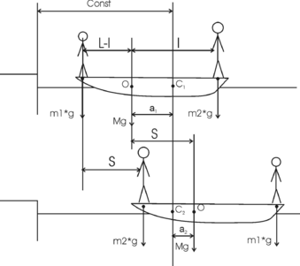| L=3 м M=120кг m1 = 60 кг m2 = 90 кг | Систему люди — лодка относительно горизонтального направления можно рассматривать как замкнутую. Согласно следствию из закона сохранения импульса, внутренние силы замкнутой системы тел не могут изменить положение центра масс системы. Применяя это следствие к системе люди — лодка, можно считать, что при перемещении людей по лодке центр масс системы не изменит своего положения, т. е. останется на прежнем расстоянии от берега. Пусть центр масс системы люди—лодка находится на вертикали, проходящей в начальный момент через точку C1 лодки (рис.), а после перемещения лодки – через другую ее точку C2. Так как эта вертикаль неподвижна относительно берега, то искомое перемещение S лодки относительно берега равно перемещению лодки относительно вертикали. А это последнее легко определить по перемещению центра масс О лодки. Как видно из рисунка, в начальный момент точка О находится на расстоянии a1 слева от вертикали, а после перехода людей — на расстоянии a2 справа от вертикали. Следовательно, искомое перемещение лодки S=a1+a2. Для определения a1 и а2 воспользуемся тем, что результирующий момент сил, действующих на систему относительно горизонтальной оси, перпендикулярной продольной оси лодки, равен нулю. Поэтому для начального положения системы M×g×a1+m1×g×(L–l+a1) =m2×g×(l–a1), откуда . После перемещения лодки M×g×a2+m1×g×(a2+l)=m2×g×(L–a2–l), откуда . Подставив полученные значения a1 и a2 в S=a1+a2 найдем . Подставляем числа. . |