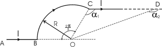404. По бесконечно длинному проводу, изогнутому так, как это показано на рис., течет ток I=200 А. Определить магнитную индукцию B в точке О. Радиус дуги R= 10 см.