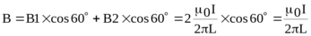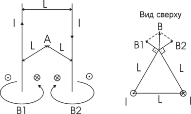 409. По двум бесконечно длинным, прямым параллельным проводам текут одинаковые токи I=60 А. Определить магнитную индукцию B в точке B (рис.), равноудаленной от проводов на расстояние L=10см. Угол β = π/3.