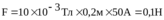 |   L = 20 см В=10мТл I= 50 А  |    Сила, с которой действует магнитное поле B на контур с током I, длинной L равна F=B×L×I×sinα. Так как контур перпендикулярен B, то α=90º и тогда F=B×L×I. Подставляем числа (переводя одновременно все величины в систему СИ).  |