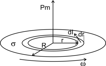 429. По поверхности диска радиусом R= 15 см равномерно распределен заряд σ = 0,2мкКл. Диск вращается с угловой скоростью ω = 30 рад/с относительно оси, перпендикулярной плоскости диска и проходящей через его центр. Определить магнитный момент Pm, обусловленный вращением диска.
