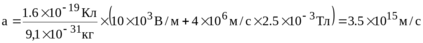 445. Однородные магнитное (В = 2,5мТл) и электрическое (Е= 10 кВ/м) поля скрещены под прямым углом. Электрон, скорость V которого равна 4×106 м/с, влетает и эти поля так, что силы, действующие на него со стороны магнитного и электрического полей, сонаправлены. Определить ускорение а электрона.