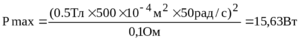 469. Проволочный контур площадью S = 500 см2 и сопротивлением R = 0,1 Ом равномерно вращается в однородном магнитном поле (В = 0,5 Тл). Ось вращения лежит в плоскости кольца и перпендикулярна линиям магнитной индукции. Определить максимальную мощность Рmах, необходимую для вращения контура с угловой скоростью ω = 50 рад/с.