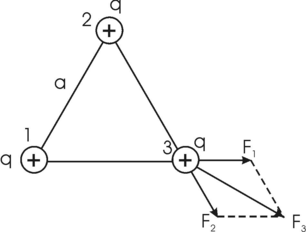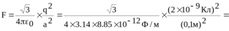 302. Три одинаковых точечных заряда q1 = q2= q3 =2 нКл находятся в вершинах равностороннего треугольника со сторонами а=10см. Определить модуль и направление силы F, действующей на один из зарядов со стороны двух других.
