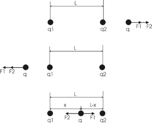 Если заряд q положителен, то при смещении его влево сила F1 возрастает, а сила F2 убывает. Результирующая сила, действующая на заряд q, будет направлена в противоположную сторону, в которую смещен этот заряд, т. е. вправо. Под действием этой силы заряд q будет возвращаться в положение равновесия. То же происходит и при смещении заряда q вправо. Сила F1 убывает, а F2 возрастает. Геометрическая сумма сил в этом случае направлена влево. Заряд под действием этой силы будет перемещаться влево, т. е. возвращаться в положение равновесия. Таким образом, в случае положительного заряда равновесие является устойчивым. Если заряд q отрицателен, то при смещении его влево сила F1 будет направлена влево и будет возрастать, а сила F2 убывать. Результирующая сила, действующая на заряд q, будет направлена в ту же сторону, в которую смещен этот заряд, т. е. влево. Под действием этой силы заряд q будет уходить от положения равновесия. То же происходит и при смещении заряда q вправо. Заряд будет уходить от положение равновесия. Таким образом, в случае положительного заряда равновесие является неустойчивым.