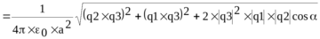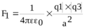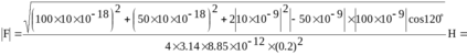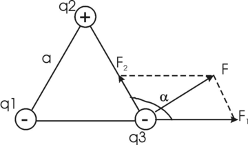 309. На расстоянии a = 20см находятся два точечных заряда: q1 = –50 нКл и q2= 100 нКл. Определить силу F, действующую на заряд q3= –10 нКл, удаленный от обоих зарядов на одинаковое расстояние, равное a.
