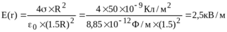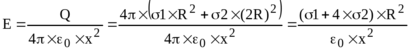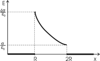 323. На двух концентрических сферах радиусом R и 2R равномерно распределены заряды с поверхностными плотностями σ1 и σ2 (рис.). Требуется: 1) используя теорему Остроградского—Гаусса, найти зависимость Е(x) напряженности электрического поля от расстояния для трех областей: I, II и III. Принять σ1=–4σ, σ2 =σ; 2) вычислить напряженность Е в точке, удаленной от центра на расстояние r, и указать направление вектора Е. Принять σ=50 нКл/м2, r = 1,5R; 3) построить график E(x).