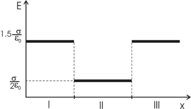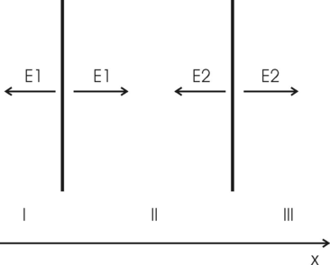 325. На двух бесконечных параллельных плоскостях равномерно распределены заряды с поверхностными плотностями σ1 и σ2. Требуется: 1) используя теорему Остроградского—Гаусса и принцип суперпозиции электрических полей, найти выражение Е(х) напряженности электрического поля в трех областях: I, II и III. Принять σ1 = 2σ, σ2 = σ; 2) вычислить напряженность Е поля в точке, расположенной слева от плоскостей, и указать направление вектора Е; 3) построить график Е(х).