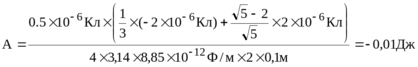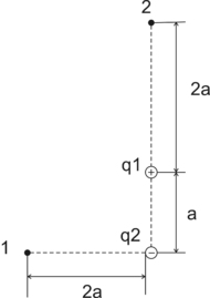 333. Электрическое поле создано зарядами q1 = 2 мкКл и q2 = –2 мкКл, находящимися на расстоянии a =10 см друг от друга, определить работу сил поля, совершаемую при перемещении заряда q = 0,5 мкКл из точки 1 в точку 2.