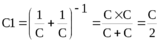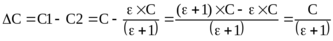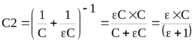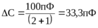 | ε=2 С=100 пФ | Обозначим электроемкость каждого конденсатора через С. Из электростатики известно, что электроемкость плоского конденсатора пропорциональна диэлектрической проницаемости ε диэлектрика между пластинами, конденсатора. Следовательно, после заполнения одного из конденсаторов парафином, его электроемкость станет равной εС. Обозначим через С1, С2 суммарные электрические емкости пары конденсаторов до и после погружения одного из них в масло соответственно. Поскольку суммарная электроемкость цепи последовательно соединенных конденсаторов равна среднему гармоническому из электроемкостей конденсаторов этой цепи, то |