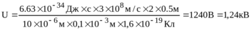 616. Из катодной трубки на диафрагму с узкой прямоугольной щелью нормально к плоскости диафрагмы направлен поток моноэнергетических электронов. Определить анодное напряжение, трубки, если известно, что на экране, отстоящем от щели на расстоянии L=0,5м, ширина центрального дифракционного максимума b = 10,0 мкм. Ширину a щели принять равной 0,10мм.
