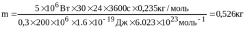 655. Мощность W двигателя атомного судна составляет 5 МВт, его КПД равен 30%. Определить месяч­ный расход ядерного горючего при работе этого дви­гателя.