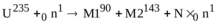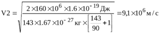 657. При делении ядра урана 235U под действием замедленного нейтрона образовались осколки с массовыми числами М1 = 90 и M2 = 143. Определить число нейтронов, вылетевших из ядра в данном акте деления. Определить энергию и скорость каждого из осколков, если они разлетаются в противоположные стороны и их суммарная кинетическая энергия Т равна 160 МэВ.