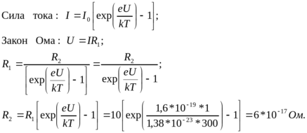 676. Сопротивление R1 р-n-перехода, находящегося под прямым напряжением U = 1 В, равно 10 Ом. Определить сопротивление R2 перехода при обратном напряжении.