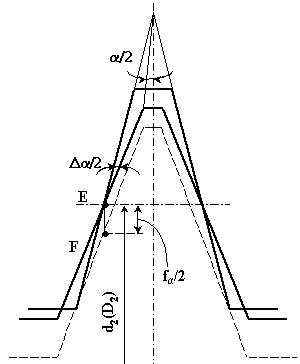 Эта погрешность может быть вызвана погрешностью полного угла профиля, перекосом профиля относительно оси детали и сочетаем обоих факторов.