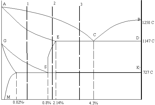 t<t3 – избыток С за счет диффузионного перемещения к границам кристалла; концентрация С на границе повышается и образуется карбид железа, формируется цементитный скелет стали. Содержание С снижается при t=t4