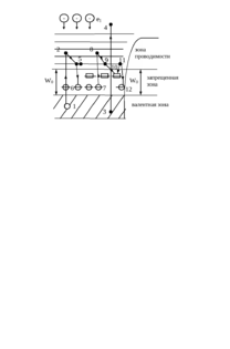 Однако большую ее часть они отдают в конце пути, поскольку имеют малую скорость. Электроны в валентной зоне, получившие энергию от первичных электронов луча, могут быть переброшены из валентной зоны в зону проводимости (1–2; 7–8) или из валентной зоны в вакуум (3–4).Если в этом случае электрон вышел из кристалла, наблюдается вторичная эмиссия. Электроны, оставшиеся в зоне проводимости, повышают электропроводность кристаллов. Это явление – возбужденная проводимость. Покидают люминофор некоторые электроны, а остальные остаются в зоне проводимости, вызывая новые акты возбуждения и выход третичных электронов. Электроны, не вышедшие из кристалла, но оказавшиеся в зоне проводимости, быстро переходят на свободные нижние уровни (переходы 2–5; 8–9). У этих электронов есть две возможности для рекомбинации с дыркой (переход в валентную зону или на локальный уровень (5–6). Переход первый маловероятен. Более вероятен второй – с выделением кванта света. Поскольку примесных уровней много, спектр излучения – полоса (тепловые колебания размывают спектр).