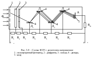 Напряжение на электроды ФЭУ подается таким образом, чтобы между каждой парой динодов создавалось электрическое поле, ускоряющее электроны от предыдущего электрода к последующему. Это обеспечивается при помощи делителя напряжения (R1R7).