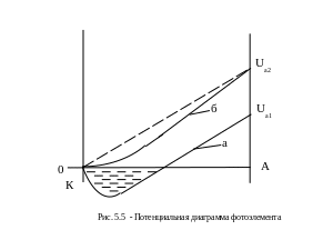а участке нормальной работы фотоэлемента (область II) практически все электроны, вылетающие из фотокатода, собираются анодом. Пространственный заряд около катода исчезает (рис. 5.5, б). Фототок принимает насыщенное значение (рис. 5.4, II), пропорциональное световому потоку. Дальнейшее возрастание напряжения Uа
