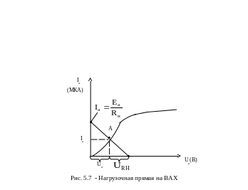 Возьмем на вольтамперной характеристике (рис. 5.7) точку А. В этой точке между катодом и анодом фотодиода приложено напряжение Ua и протекает ток Ia . Чтобы найти, какое напряжение падает на Rн и чему равно напряжение источника питания при этом, построим нагрузочную прямую. Чтобы построить прямую, достаточно найти две точки.
